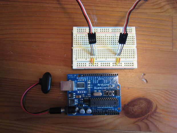 7. por último, conecte la tierra y el poder de las baterías 4AA a la tierra sin soldadura breadboard y el poder. No se alarme si los servos pone en marcha cuando su Arduino no tiene poder o aún no se programa.