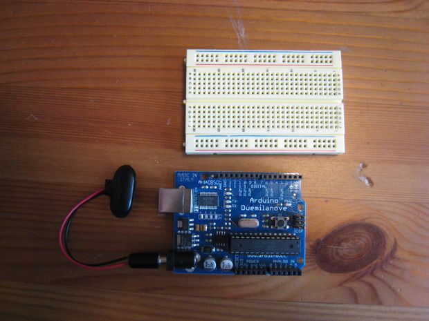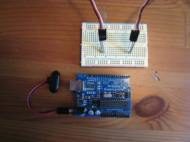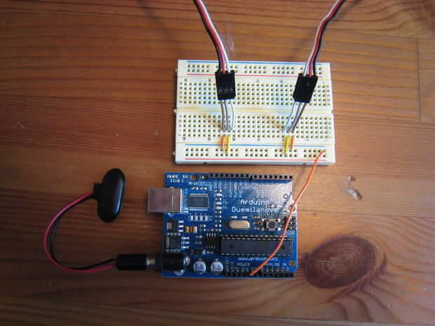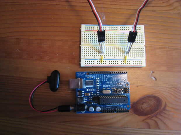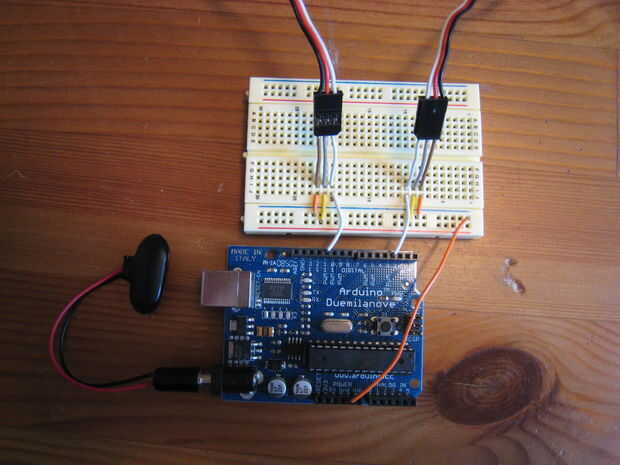 1. la primera cosa a hacer cuando se configura la placa solderless es establecer la tierra (GND) y energía (+ 6V) para los servos. Opté por usar las dos tiras largas en la placa que sería más cercana a la Arduino.