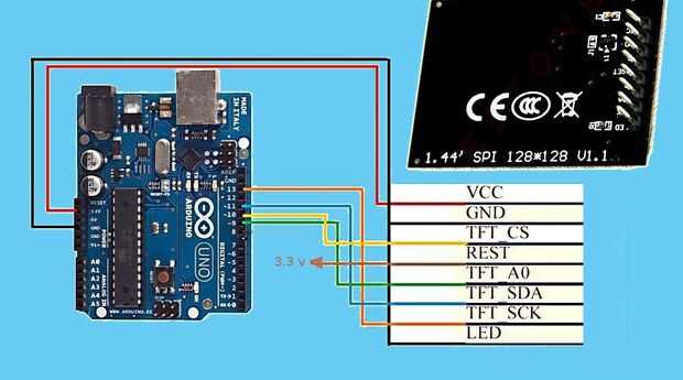 Empezaremos con una simple. La pantalla ILI9163 tiene una resolución de 128 x 128 píxeles. Con 8 pernos en una sola fila, funciona bien con un Arduino UNO estándar o con un Mega. La conexión de hardware es simple - sólo 8 conexiones total! La biblioteca reunida por un chico inteligente, con el nombre de sumotoy, hace posible para mostrar texto en varios colores y para dibujar líneas.