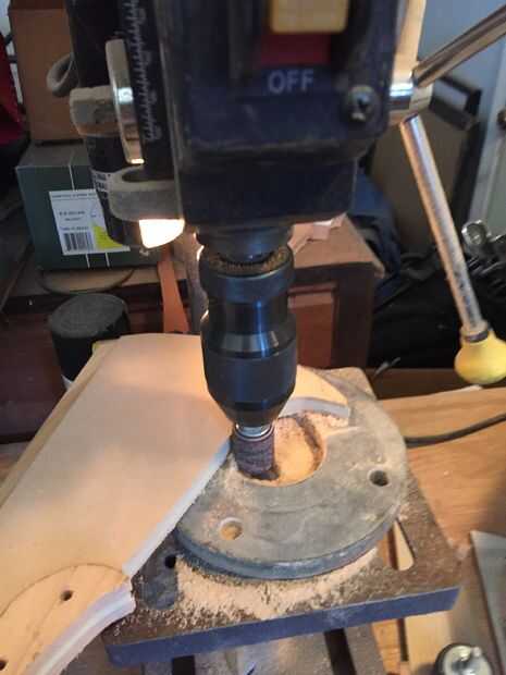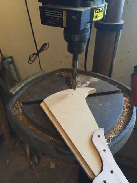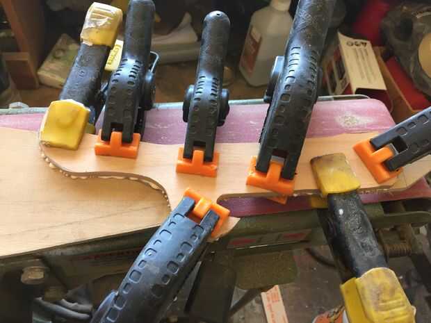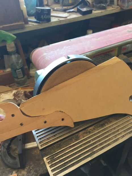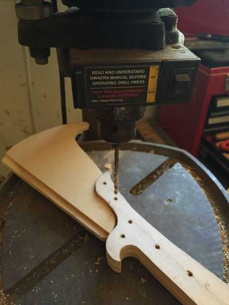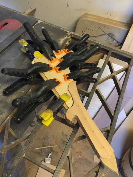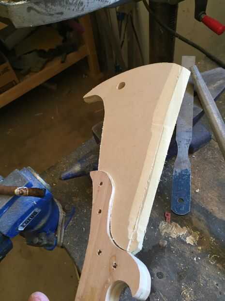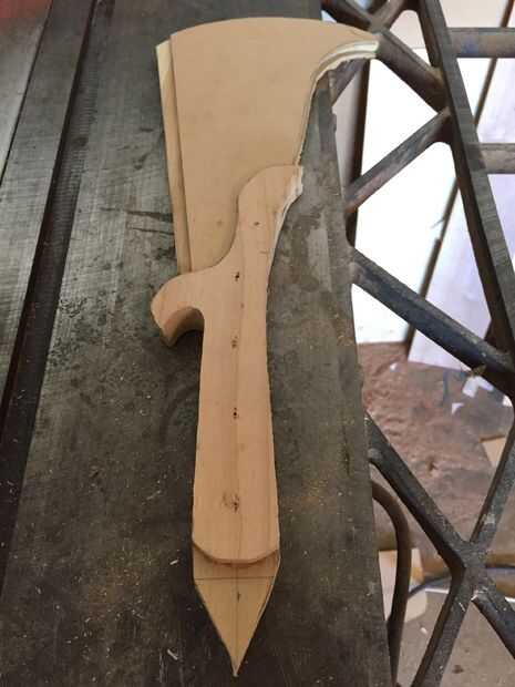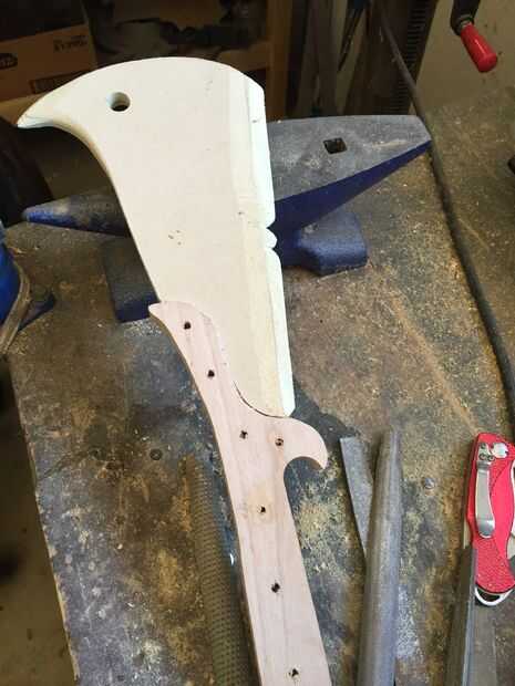 Usé pegamento de madera de alta resistencia para adherir las piezas de madera juntos, sujeción en su lugar. Después de que la pieza curada I corte y lija suave en el perfil y marcó una línea de centro de la hoja. Después lija y presentó la cuesta hacia la hoja, redondea la manija y formó la espiga posterior. He añadido muescas y marcas de desgaste en la cuchilla que muy utilizada y buscar por encargo.