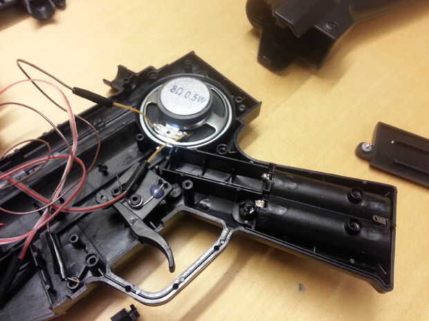 Lo que queremos hacer es hacer el circuito de la soundplayer Arduino conectarse cuando el gatillo. Una manera muy sencilla para hacer esto es colocar un material conductor en el interior del disparador y a una zona cercana. Cuando el gatillo, los materiales conductores tocan y tendrá un flujo de electricidad a través del circuito. Empezamos por ripear todo pero el altavoz incorporado: