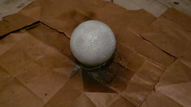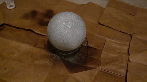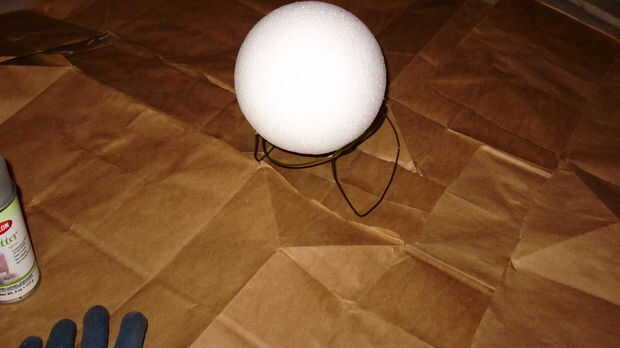 quería una capa base de material reflectante, brillante para que cualquier lugar donde los espejos no tenga alguna cualidad reflexiva.  Esta bola usada casi este mini todo puede de pintura en aerosol.  El soporte para la bola rápidamente hizo torcer algún alambre de percha en una forma que la bola de la tierra.