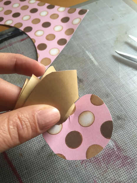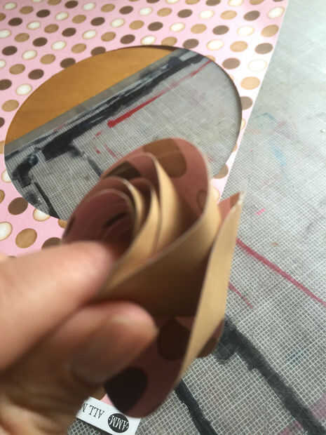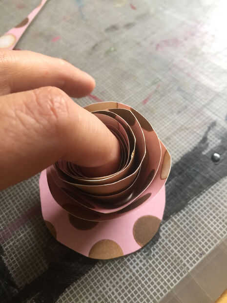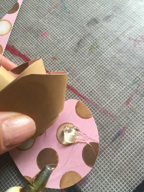 Una vez que tienes tu flor de papel laminado en el centro, dejó la flor ampliar al tamaño deseado. Después de tener el tamaño deseado, colocar un círculo de pegamento caliente en la base de la flor y el centro de prensa en el pegamento caliente para mantener en su lugar. También puede pegar la base de los lados un poco para dar su flores de una forma diferente como se ve en la tercera a la última foto.