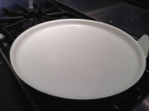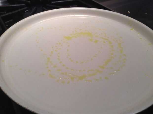 En primer lugar, poner la olla sobre el quemador. Encienda el ventilador. Coge una lata de aerosol de "Pam" (aceite de cocina). Rocíe la cacerola. Girar el calor a medio-medio alto. Espere a que caliente. (Prueba por salpicadura de una gota de agua en la cacerola. Si chisporrotea, el pan es todo calentado.)