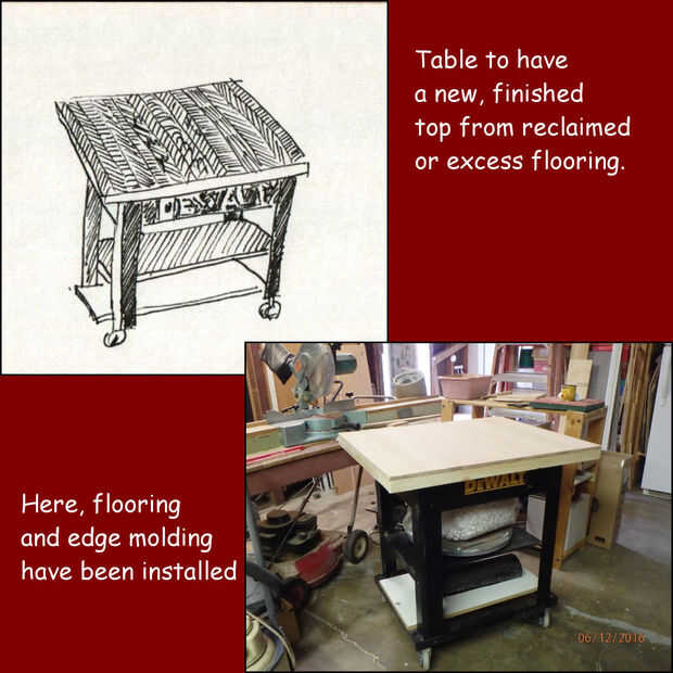 Tenía este soporte de la tienda de Dewalt y había cubierto con una pieza antigua, meteorizada de 3 /' madera contrachapada de 4 pulg. Aunque extremadamente funcional, el stand parecía muy paliza. Así que sabía que podía hacer que se vea muy bien con el revestimiento del piso. La foto de arriba muestra recién instalada suelo.