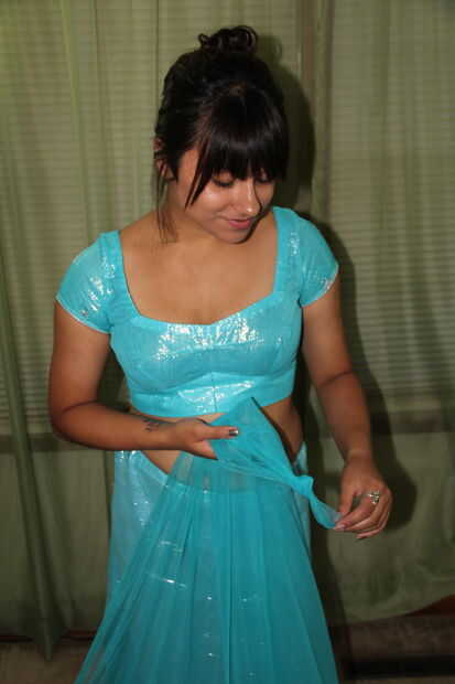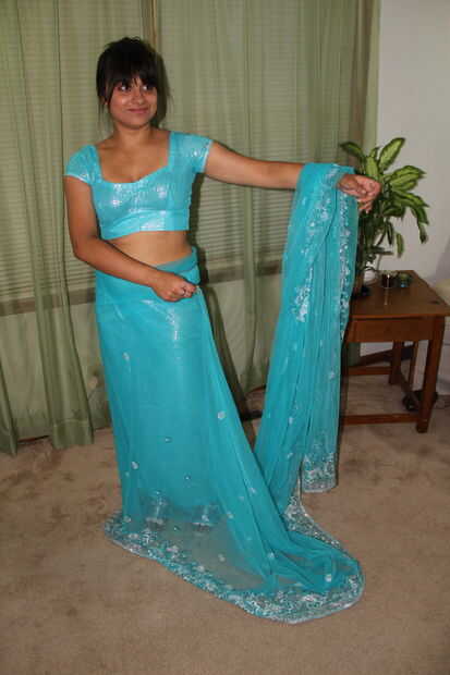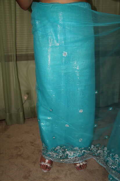 2. hacer una vuelta completa de derecha a izquierda. El extremo inferior de la sari debe estar ligeramente por encima del piso.