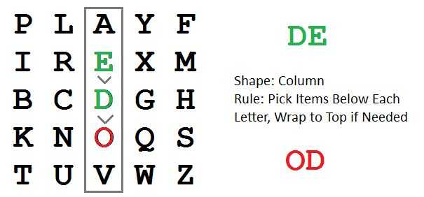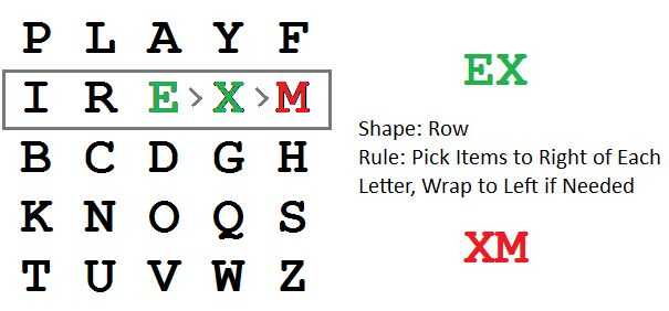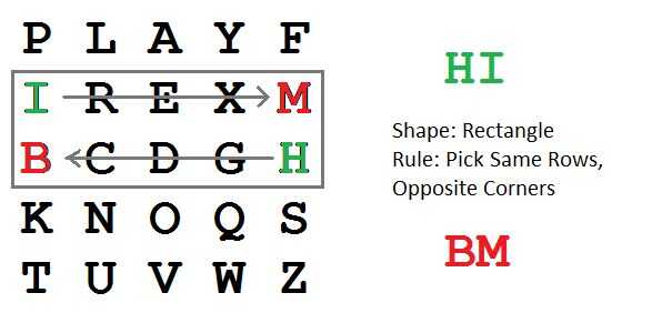 1 si las dos cartas en diferentes filas y columnas (diagonal de uno a) imagina que las dos letras forman la esquina opuesta de una caja. Escriba las letras que están en la esquina opuesta. Es importante el orden escribes. Cualquier carta es la primera en el par original de números, la nueva carta cifrada que se encuentra en la misma fila (en la esquina de la caja imaginaria) llegue primero. Si no tiene sentido, la primera foto puede ayudar.