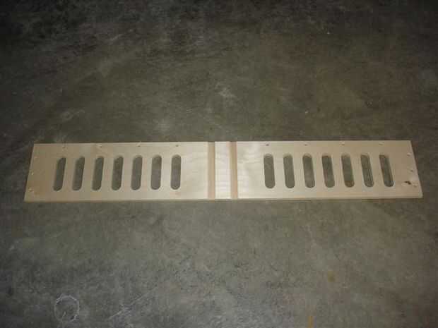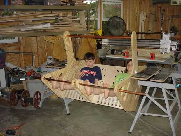 Comience con los lados del asiento. Están hechas de madera contrachapada de 3/4". Dibujar el patrón en la madera contrachapada y recorto. Asegúrese de que hacer una versión de mano derecha e izquierda. Perforar todos los agujeros como se muestra en los planos. Encamina una ranura en las partes a aceptar las partes de asiento, pero esto probablemente no es necesario y puede ser difícil de hacer a mano. La barra superior es 1" cobre tubería con tapones. Pensé que apoyo el lado de flexión en y dar algo para tomar mientras recibe. Taladré agujeros de fondo plano el diámetro de los casquillos de la pipa sobre un 1/4" de grosor. Corrí self tapping tornillos a través de los lados y en la barra transversal para asegurarlo.