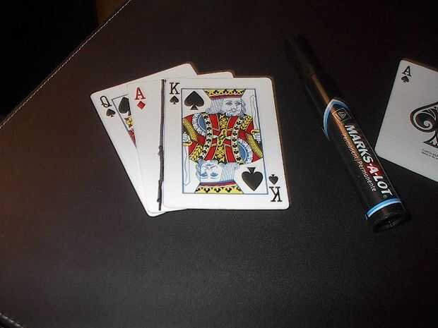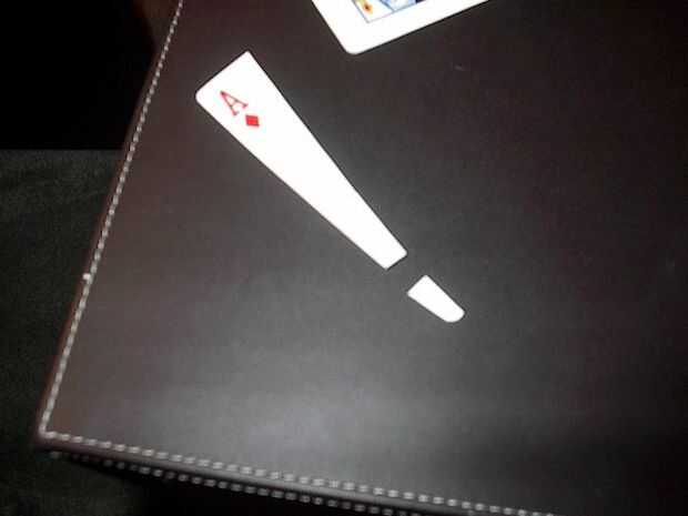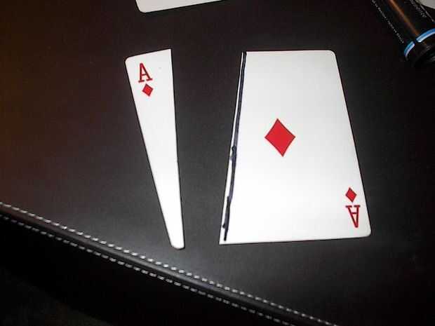 Coloque el as de diamantes en, permite decir, 30 grados. Dibujar una línea y cortarlo en dos. Luego corta 3/4 de un centímetro de la parte inferior de la tarjeta.