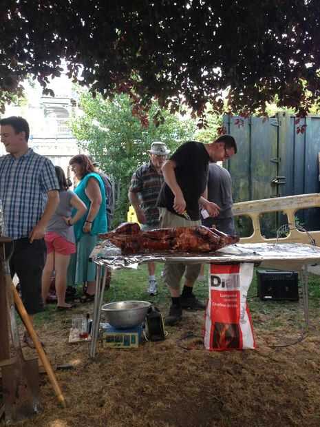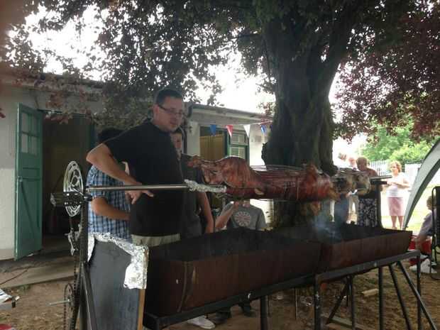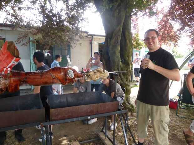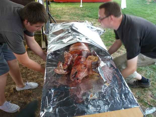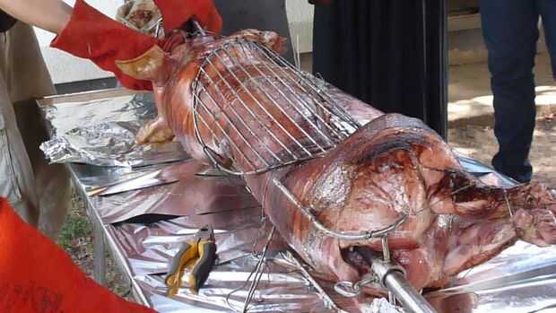 La cabeza del cerdo es una fuente de gran fascinación - lo ponemos en el plato con el resto de la carne y todo tipo de personas que jugaron con él. Sacó la lengua con una pinza - era muy sabroso. Como gammon!
