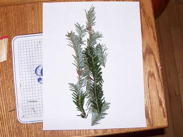 a continuación, poner las ramitas de pino en una fila en medio del papel.
