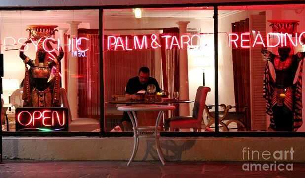 Aunque no me gusta usar luz artificial, como destellos o luz adicional, el hecho es a veces artificial luz es la luz natural de una escena. En la escena del restaurante, los servidores están iluminados por las luces brillantes en el buffet, lo que se destacan claramente. En el lector de la palma y la tarjeta de Tarot de la ventana, la luz roja de neón, con la Figura solitaria en la mesa, es lo que crea el impacto de la vista.