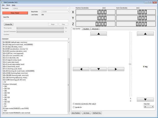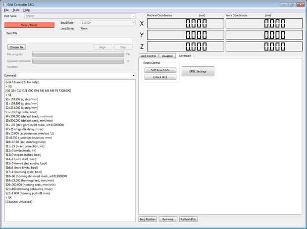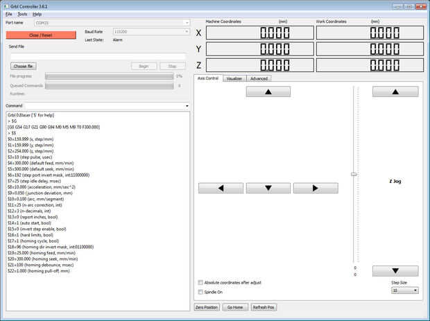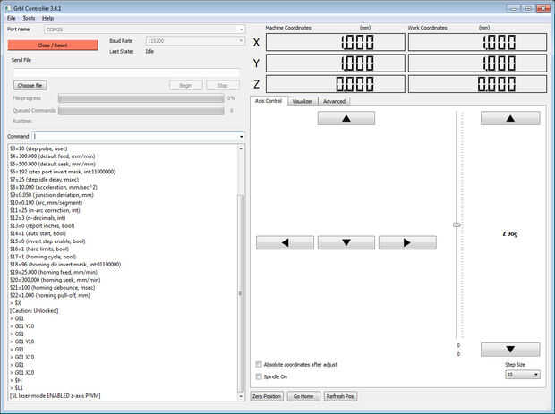 Si Grbl regulador puede establecer una conexión con GRBL usted será presentado con un texto en el cuadro de mensajes; en la pantalla debe ser Grbl0.8laser. Entonces habrá una carga de valores $. Estos valores son los valores predeterminados para GRBL.