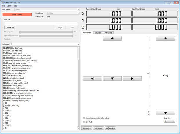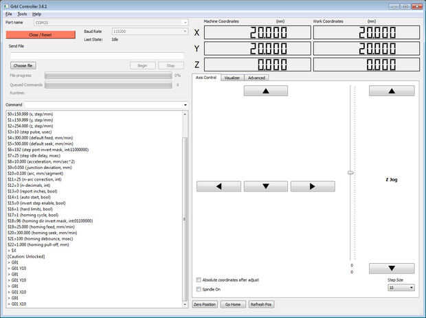 En primer lugar | Desbloquear GRBL con $X, o abrir la pestaña avanzado y haga clic en el botón de Desbloqueo Grbl , volver a la ficha de Control de eje cuando haya terminado.