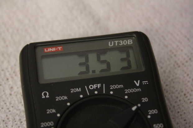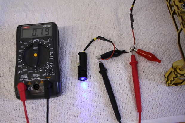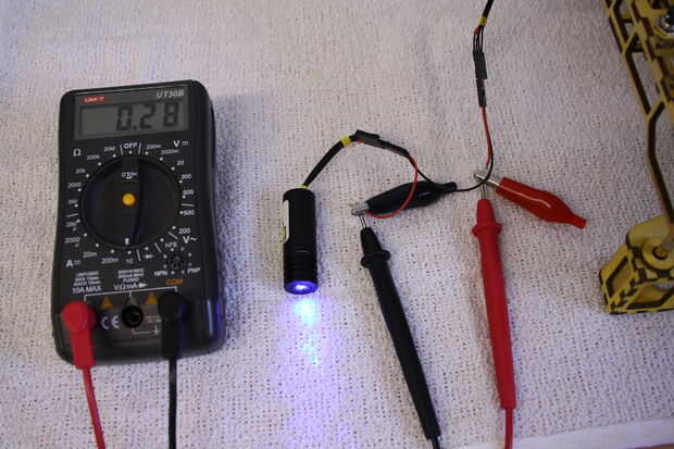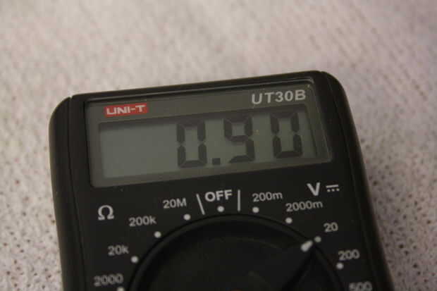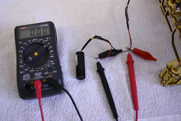 8 | Utiliza tu multímetro para medir el voltaje diferencial entre los cables positivos y negativos que el módulo del Laser. La primera vez que medí fue en 0.90v