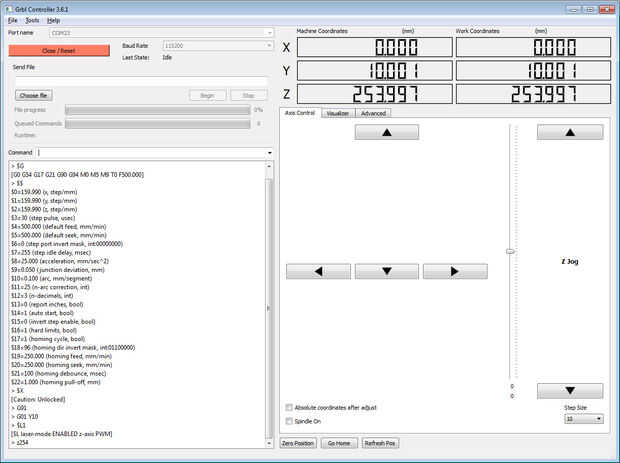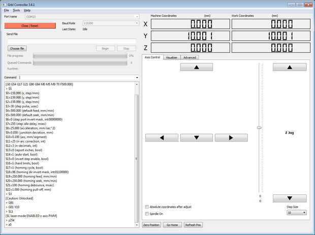 7 | En el cuadro comando, escriba Z254. Esto ajustará la salida PWM a 5v máximo ajuste del LCM a plena potencia del láser.