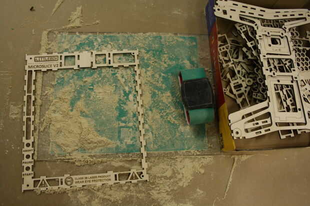 He adjuntado algunas lija 120 usando cinta de doble cara a una hoja de vidrio templado. El vidrio fue recuperado de un viejo escáner de superficie plana.