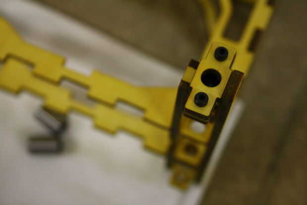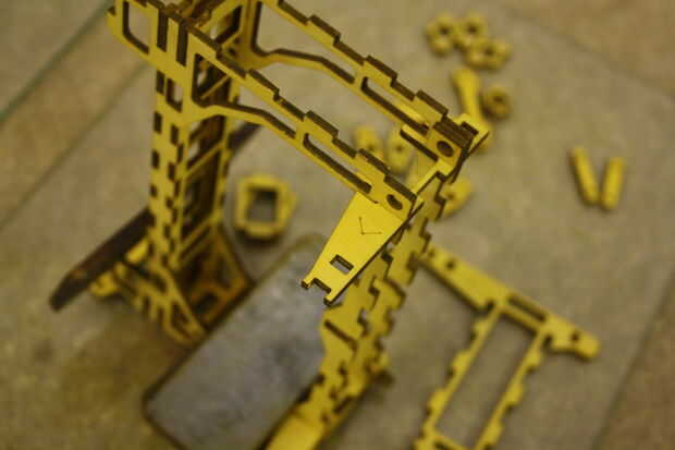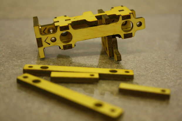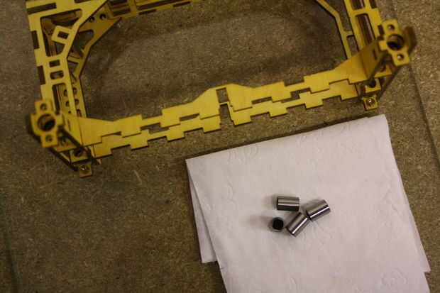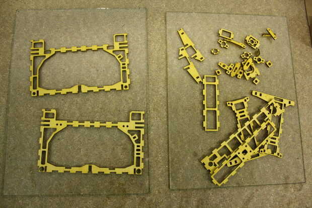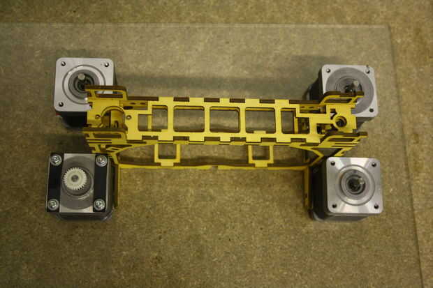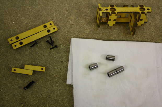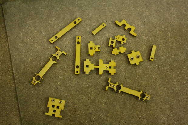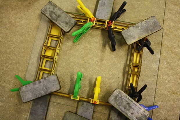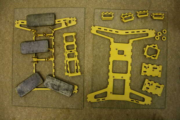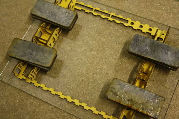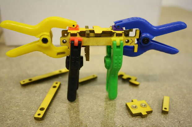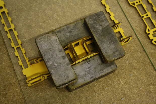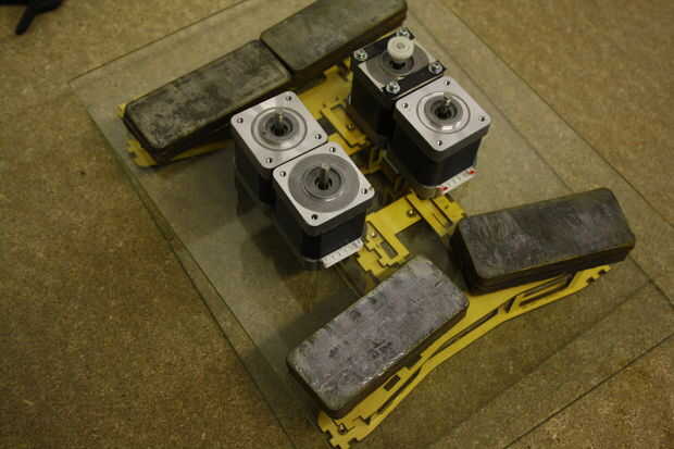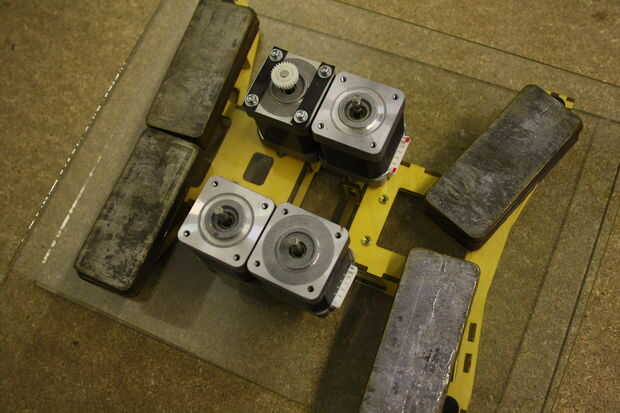 Las piezas se llevan a cabo utilizando plana lingotes de plomo de 250 g, y algunos recuperado motores paso a paso. Estoy usando Abrazaderas Mini para Mantenga todos juntos mientras las secas pegamento.