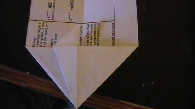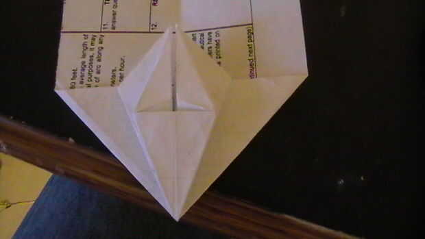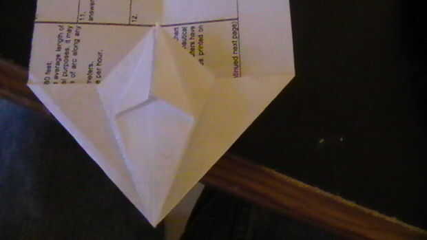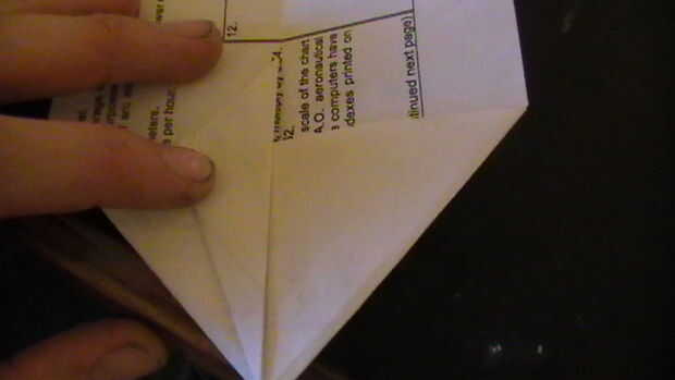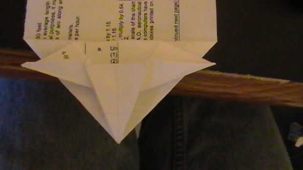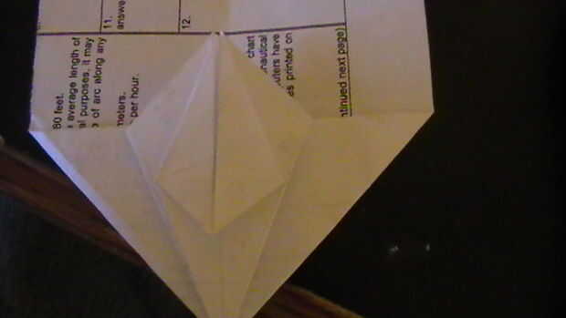 Este paso tiene el potencial para enviarle a psych ward, como se indica en el título. Ahora, desde nuestro último paso, doblar la parte superior de las aletas en la mitad, like(pic7). Luego despliegan y empujar la pieza doblada adentro, like(pic8). Cuando ambos lados están hechos así, doblar la parte trasera de nuestro diamante incluso pequeño, como el so(pic9). Esto sólo se hace en la solapa superior. Una vez que esto ha ocurrido, levante la pequeña aleta entre las aletas más recientemente plegadas, para obtener de esta forma (pic10). Ahora para el paso difícil. Si usted tiene dudas sobre su cordura o se sienten frustrados por los últimos pasos, salir ahora, tomar un descanso de 24 horas y probar otra vez mañana. Todo lo que tienes que hacer es doblar esa aleta acaba de traer hasta abajo a través de las aletas de otros y dentro del diamante superior. Si se hace correctamente, usted debe obtener este triangle(pic11) isósceles aguda. Ahora para la etapa definitoria de este avión: doblar hacia fuera los canards. Este es el simple proceso de yanking en la punta de las aletas medias y tirando de ellos hacia abajo y hacia fuera, para obtener this(pic12). Si ya completaste esta página en su totalidad, Dése una palmadita en la espalda!