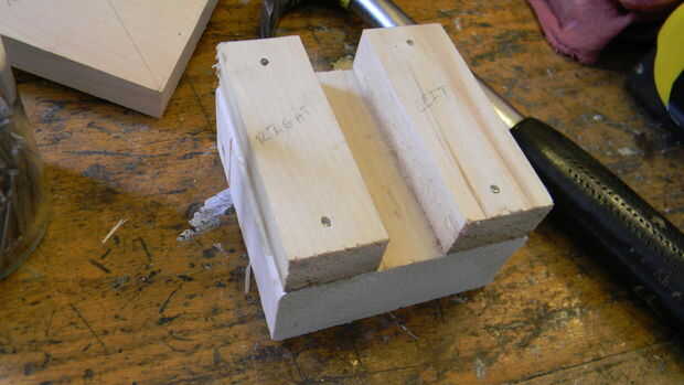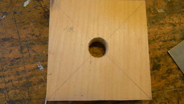 Corte toda la madera a su tamaño y luego marque los dos 4 x 4'' superior e inferior. encontrar el centro del bloque superior y taladre un agujero con la broca de 3/4 '' o 15/16 ''. Reservar ambas piezas. toma el fino 31/2 x 31/2 '' pieza y la pieza larga de madera de la misma anchura. (1'') Poner la pieza del top 4 x 4'' y colocar encima de la fina 31/2 x 31/2 ''. Utilizando un lápiz, poner un punto en la 31/2 '' pieza por el agujero, para que sepa dónde colocar su pedazo largo. Centre la pieza larga de madera sobre el punto y marque donde está con un lápiz. hacer las líneas que usted acaba de hacer aproximadamente 1/16 '' más grande, y cortar en cualquier Sierra, sólo asegúrese de que es. Después de esto, cuidadosamente pegamento y clavos a la madera que se corta a la más grueso 31/2 x 31/2 '' la pieza.