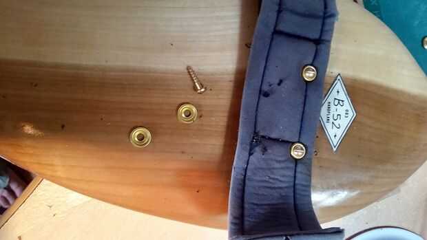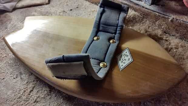 He utilizado el accesorio del tobillo del velcro de un leash de tabla de surf antigua. Asegure la correa alrededor de su mano, coloque la correa en el tablero y marque los orificios a través de la correa. Utilicé tornillos de latón ranurado con tazas.