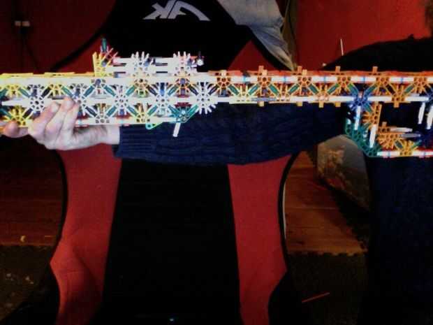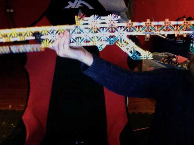 esto es, de lejos mi mejor arma diseñado que he hecho. es muy precisa y con una buena banda de goma tiene un buen rango (40-50 pies). la acción es duradera y el mango diseñado para parecerse a los springfields. está cargada y dispara barras blancas.