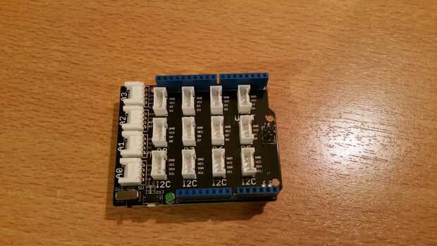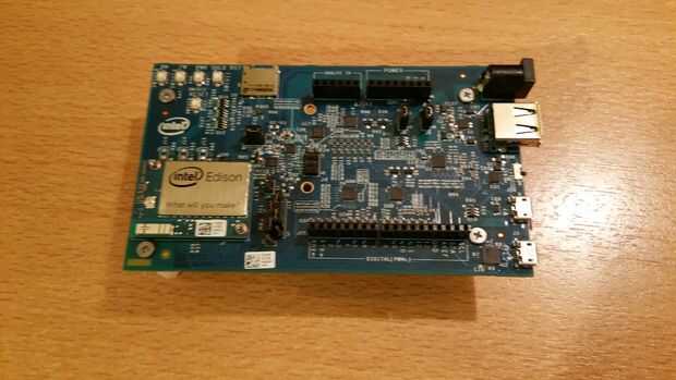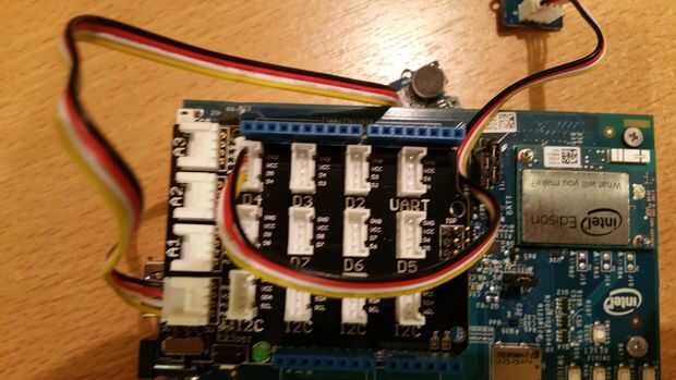 -Empezar por insertar el escudo de arboleda en las salidas de pin de Arduino de la intel Edison - teniendo cuidado de no doblar las patas mientras ponía.