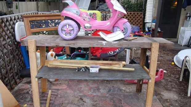 Empezó a llover por lo que no llego a añadir cualquier diagonal ayudas pero su ya robusto incluso con hacia fuera la parte superior está conectada y a pesado para poder dar la vuelta en mí misma para montar las ruedas. Hay que ir, en casi una hora y utilizando todos los materiales de reciclado tengo un banco de trabajo sólido que debería durar bastante tiempo... el triciclo de Barbie... necesita una batería de