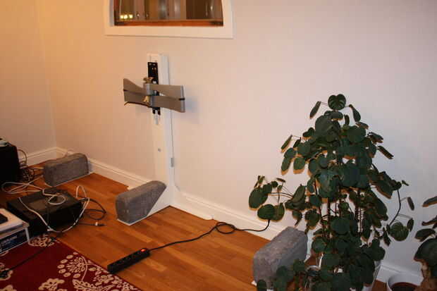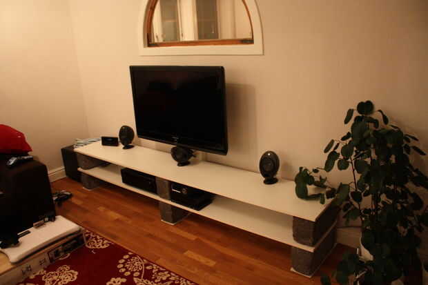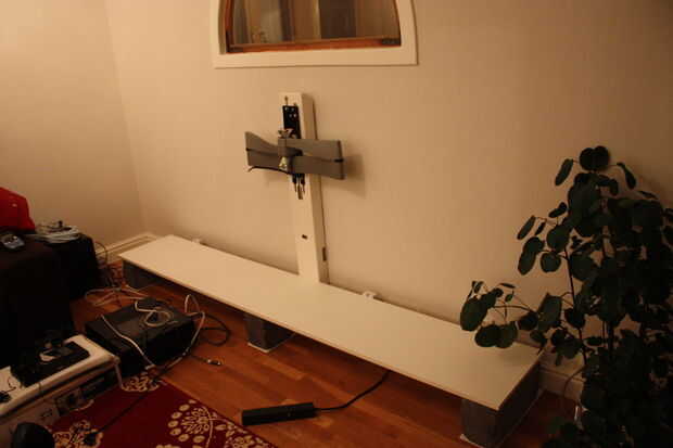 El siguiente paso hemos pensado en más tiempo (un año después de que el Banco inicial fue hecho). No queremos que la tv pie ontop del Banco, ambos odiamos los soportes de la tv y pensar en la idea de tener una (lo que llamamos) cuello de tv. Dos días después y el proyecto estaba listo y enviado a nuestra tienda local del metal de hoja para el laser de corte y doblez. Conseguimos un buen precio para la 2mm (supongo que tenían algunos trabajos ya de ese metal) metal de hoja y dos semanas después tuvimos el cuello de la tv (en piezas) en nuestras manos. Un amigo nuestro trabajo como soldador y después de la compra le un almuerzo y un café tenemos el cuello soldado con autógena. Poco más adelante de la capa de polvo y de los resultados es como se muestra en las fotos. No dude en utilizar las huellas azules del cuello tv. Está construido de manera que debe ser bastante fácil de soldar. El cuello se puede almacenar mucho cables flojos y debería funcionar con cualquier plano de la pantalla tv. Gracias por tu tiempo, espero que usted encontrará algunos trozos de buena información.