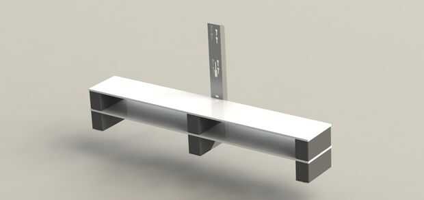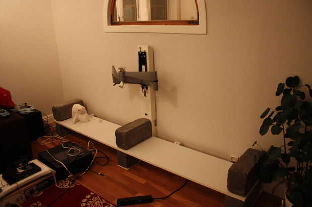 Después de algunas investigaciones, llegamos a la conclusión, bloques de hormigón y mdf hará el truco. 2 tableros de mdf, que hará prácticamente cualquier tamaño pero nos acomodamos para 400x2480x18mm. Para acompañar ese mdf tamaño 6 concreto bloques fueron comprados en la misma empresa, 390x190x138mm de tamaño (22kg de peso).