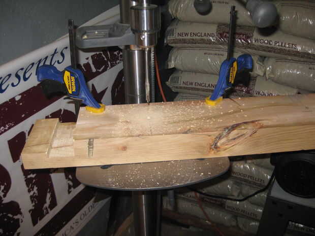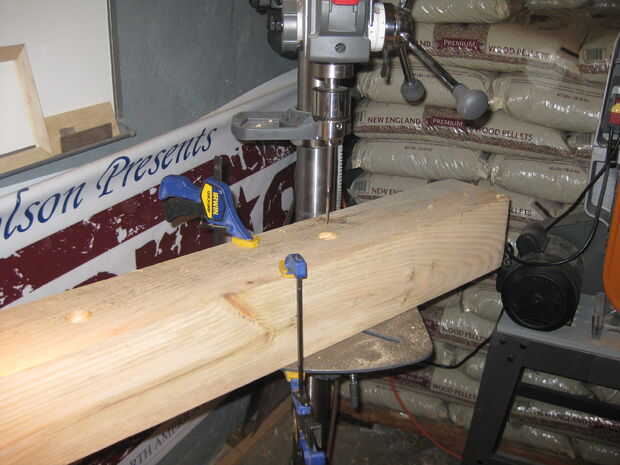 Para ello, todos los agujeros en una cara exterior comenzó con un 1 1/4" agujero lo suficientemente profundo para una arandela y una tuerca, entonces perforados a través con un 3/8" bit. Algunos de los miembros internos también tienen 1 1/4" agujeros para la fijación alineación. Esto hará más sentido más adelante.