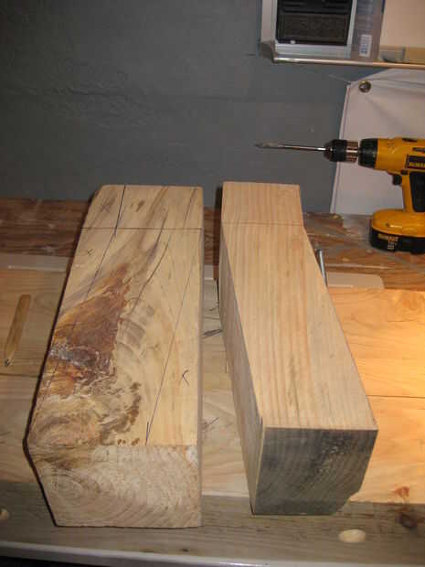 Los ángulos de la pierna fueron cortados con la sierra. Una sección de las patas traseras entonces fueron recortados para aceptar el asiento. Lo hice haciendo varios cortes paralelos con una sierra circular y luego quitar los residuos con un martillo y la herramienta 5 en 1, desde que no tuve cinceles en este momento.