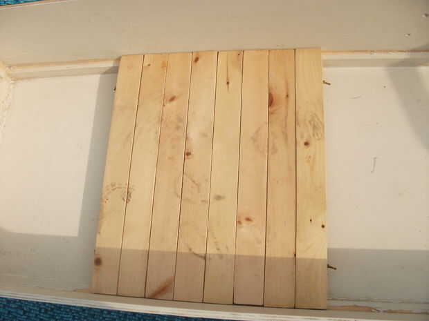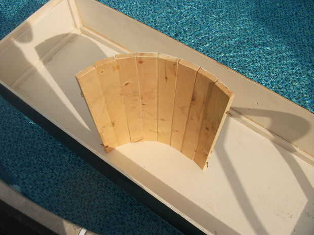 También hice un cambio para el diseño de asiento que había utilizado en su barco. Porque mi hijo es cerca de 100 libras más ligero que yo, nuestro lastre en la embarcación debe ser arreglado de otra manera. Él puede sentarse parte posteriora mucho más lejana que yo sin tomar agua en la popa. Para ello que usé el 1 x 2 tableros ensartados y puso en la base de la embarcación en los rieles de 1 x 2. Podemos deslizar esta adelante hacia atrás sin problemas. También no estaba cómodo con cómo su asiento se sentó y temía que creara un demasiado alto centro de gravedad en un barco ya tambaleante.