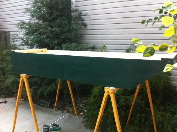 Cuando la silicona se haya secado, usted está listo para pintar el barco. Utilicé una pintura de esmalte de látex de Valspar. Aplicamos tres capas de las superficies externas de la embarcación (verde en cuadros) y dos capas en el interior las superficies (tan en las fotos). entre cada capa yo esperé el tiempo recomendado para el secado y lijado ligeramente.