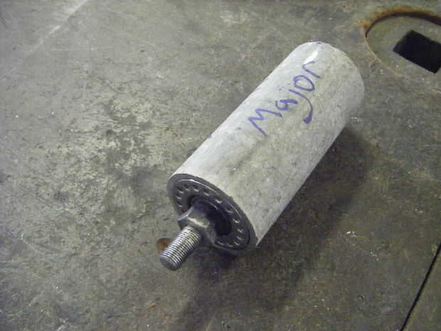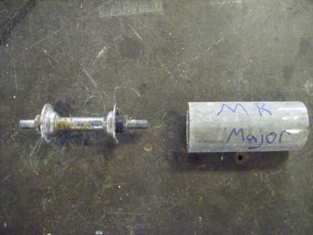 Para evitar que la columna de dirección moviéndose arriba y abajo debido a la fuerza ejercida por una persona sentada sobre el barril, es mejor utilizar un concentrador de bicicleta para asegurar la parte superior de la columna. Sin embargo, para permitir que el conjunto del cojinete para permanecer en el interior del barril, una tubería es necesario para que el cojinete puede fijarse en el interior del barril, pero todavía permite la parte superior del huso eje sobresale por la parte superior del barril. Esto minimiza el trabajo exterior, manteniendo el barril reconocible. El eje se desliza dentro del tubo, con uno de los extremos del huso sobresale completamente (ver foto derecha) y en el otro lado, el eje sobresale pero no tanto para que las tuercas de bloqueo se extienden más allá de la tubería. Tuve la suerte suficiente procurar una longitud de acero tubería forma el eje con muy poco trabajo.