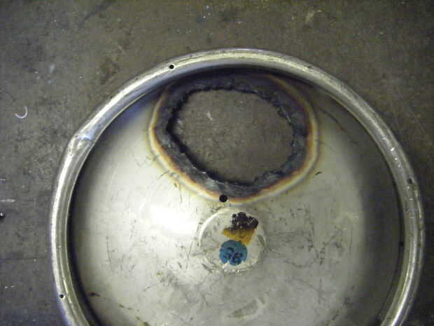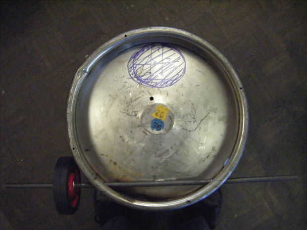 Es necesario un agujero para que la rueda delantera volver a salir. El objetivo es que la rueda delantera es apenas visible cuando el barril, así que el agujero es en la parte inferior. Para ello, marcar un área conveniente de la rueda y cortar con un soplete de acetileno de Oxy. Usted podría fácilmente encontrar otra manera de hacerlo, esto es solo como lo hice.