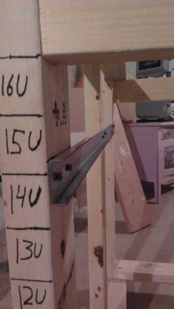 Tratar de encontrar dónde el servidor va a sentarse, luego encontrar la distancia entre el guión bajo el labio y la parte superior del servidor. Tomar esa distancia y poner su carril eso distancia de la parte superior de la "U" desea que su servidor a habitar. Marcar con un rotulador y luego perfore los agujeros donde van los tornillos en los rieles. Después de esto puede tornillo les encima.