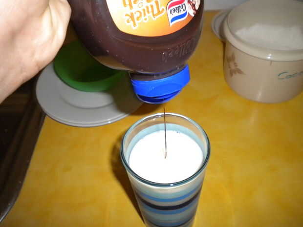 Llenar la taza con la leche hasta que hay solamente dos centímetros de izquierda. Añadir un splodge de cobertura de chocolate y jarabe de arce (cuanto más, mejor pero no van demasiado loco). Poner en una media cuchara de coco rallado. Limpie la cuchara por lo que no hay nada en él y luego añada una cuchara entera de azúcar moreno. Revuelve todo hasta que la mezcla se convierte en un color marrón medio de la luz. Poner la bebida en la nevera y dejar enfriar durante 5 minutos... O simplemente omitir este paso y tomar las cosas sin enfriamiento adicional.