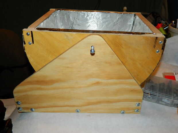 Para este horno encontré un marco de 8 x 10 por 99 centavos en el fondo de comercio. La madera de una remodelación que pasaba. Tuve que comprar las bisagras y cerraduras de una tienda de reciclaje. 2 latas grandes de palomitas de maíz, aislamiento de fibra de vidrio de un sitio de construcción. Bandeja aluminio pintura rejilla 1,99 en walmart, Perchero de metal, aluminio Alumimum. La mayor parte de la obra se realizó con una sierra dremel herramienta y sable. 1/2 la longitud exterior determina el radio de corte dremel exterior. otro corte 3/4 de pulgada dentro del interior lata. Construir el stand 1/2 pulgadas más ancha que el horno de curvado. Elmers pegamento para los extremos de la hoja de aluminio