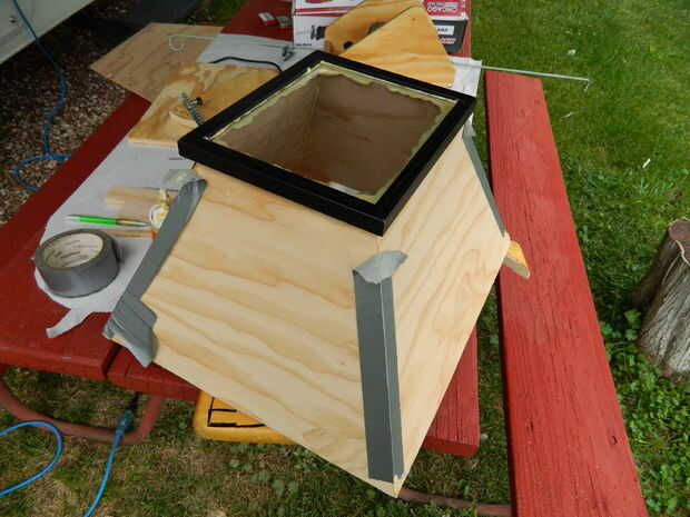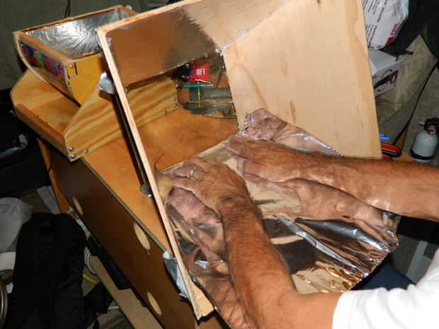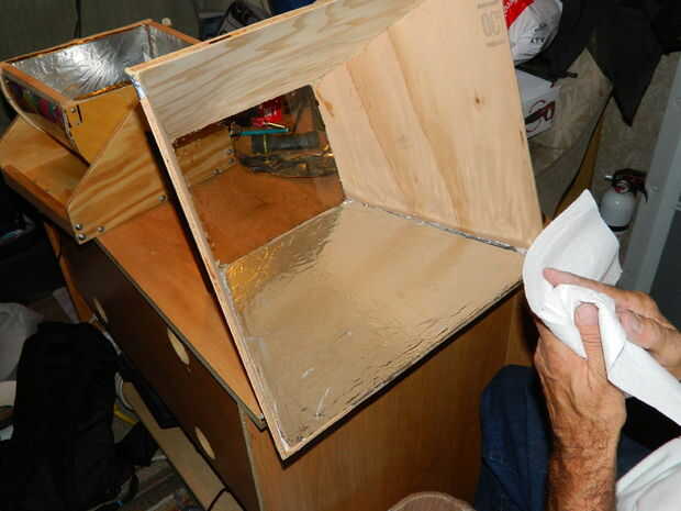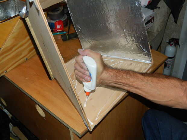 Los reflectores son de madera contrachapada de 1/8 en un ángulo de 60 grados. Biselado con bordes para una buena costura pegamento de Gorrilla. Pegados en papel de aluminio. Pegados los reflectores a marco. Utiliza 2 bisagras perno desmontable y 2 cierres entre marco de madera y caja de curva.
