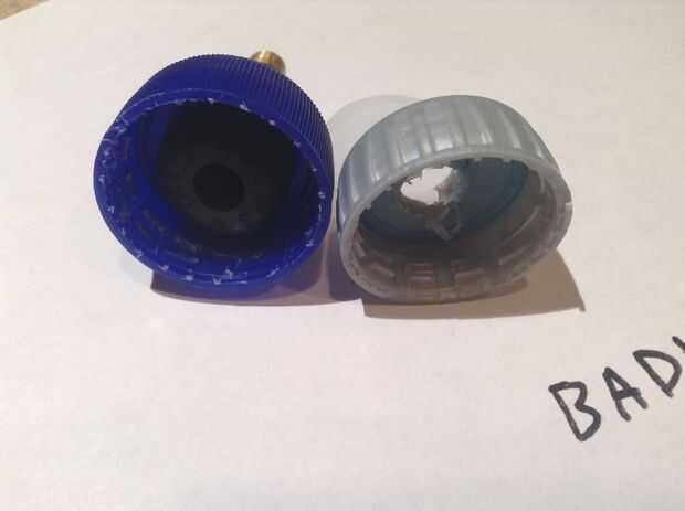 La tapa gris es antes de la extracción del hilo de rosca y el azul es después.