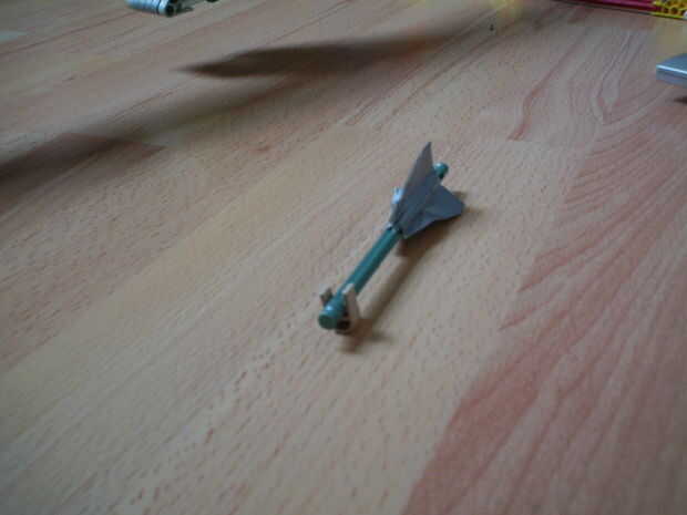 La bala es una barra roja con un clip tan en la cinta frontal y pato en la parte posterior de algunos estabilización cuando en el aire.