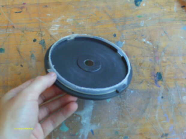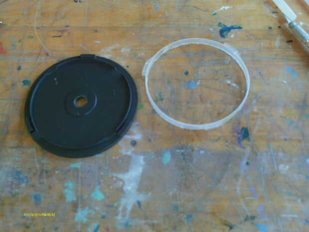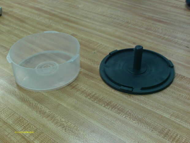 El concepto es que un CD husillo encaje en su tapa girando. ¿Por qué no usar ese mecanismo de bloqueo aquí? Todo lo que necesitaba era la parte plana de la tapa y el asa de plástico con los dientes de bloqueo en él.
