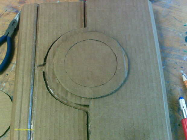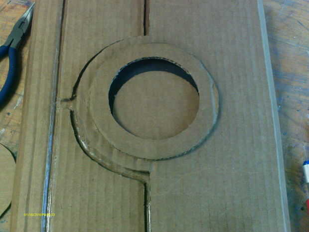 Usé una sierra para metales para cortar el anillo de plástico con los tres dientes en él y cortar un agujero en mi cartón de cierre del mismo tamaño. Los dientes impiden que mi aro dentado plástico tirando hacia fuera de una manera. Pegar un círculo de cartón para el aro en los bocadillos de lado en lugar, pero todavía le permite girar libremente. Utilicé una sierra de arco para tomar el eje de la tapa y me caliente pegado a la tapa frontal. Ahora, cuando el cerrojo está cerrado, el círculo de cartón que da vuelta se asegure.