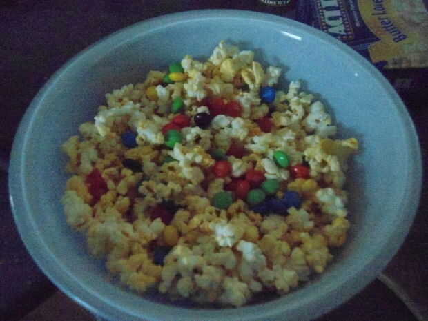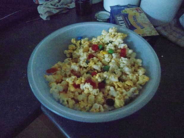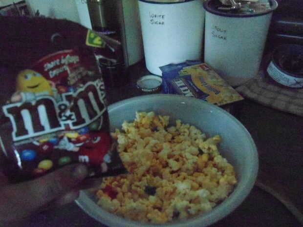 Esta es la mejor parte. Te recomiendo m & m ' s porque son de chocolate y crujiente al mismo tiempo. Porque los caramelos gomosos ya son dulces y pegajosos, sugiero poner sólo un puñado más o menos en la mezcla. Estos dulces agregar color y una excelente mezcla de sabores. El chocolate y caramelos contrarrestan la salinidad de las palomitas de maíz.