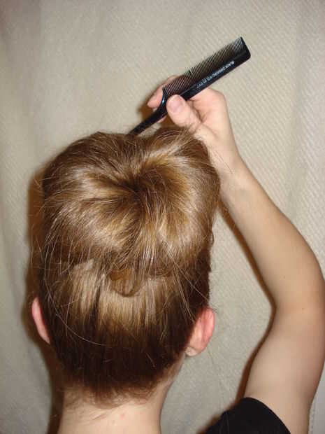 1. Utilice el extremo de un peine de cola de rata y ajuste el pelo en el bollo hasta que todos los lados del moño tienen una cantidad uniforme de pelo