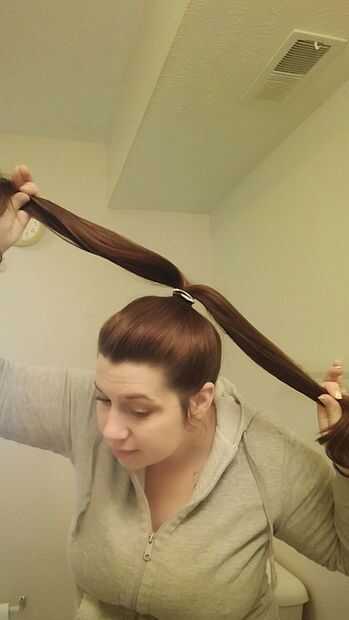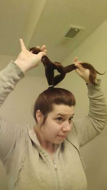 no, really! divide la cola de caballo en 2 y poner un nudo en él como está atando un espectáculo. tensar la parte delantera hacia fuera su bollo