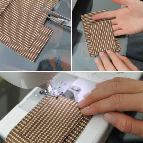 Repetir con la siguiente bolsa y utilizar una tarjeta de crédito para medir el tamaño. Coser el bolsillo de tarjeta en el bolsillo de iPhone.