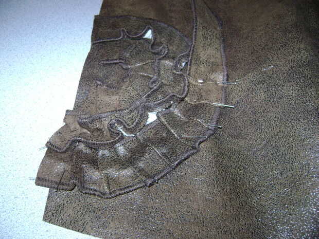 Hilvanar la parte de otra tira hacia abajo el centro a crear una arrugada hasta la colmena. Pespuntes es aceptable siempre y cuando usted utilice la puntada más larga su máquina puede hacer y utilizar una tensión menor por lo que fácilmente se tirará el hilo. Aferrarse se reúnen apretado de 1 hilo la tela el hilo, sosteniendo el otro extremo del hilo para que no tire a través o se reúnen las Naciones Unidas sí mismo. Querrá atar nudos en el hilo una vez que tengas volantes como usted lo desea. Pin el volante para que el basted line(center) en la tira es aproximadamente 1/2" más allá del borde exterior de la sección volante doblado cosido abajo. Este volante debe superponerse el volante doblado. A PIN por lo que hace un círculo de 1/2 en el borde exterior. Corte el exceso y coser a lo largo de la línea devengarán.