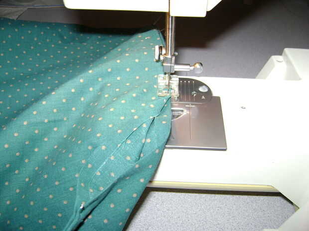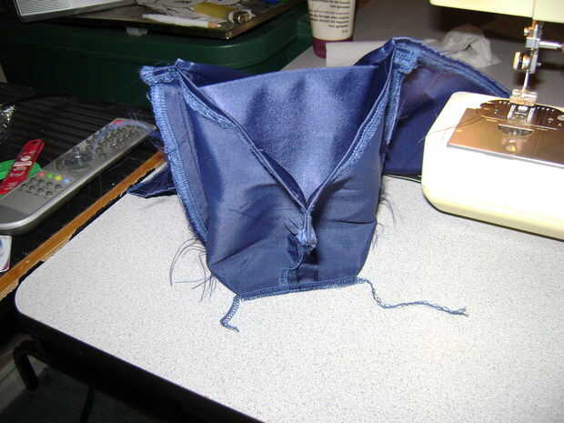 Con su revés contra derecho hacia fuera, coser el borde largo de los parte inferior derecho lados juntos. Usted quedará con una gran plaza plegada en cada extremo. Pellizcar los bordes plegados juntas y uniformemente por lo que las esquinas están ahora juntos, todavía derecho lados juntos. PIN y comience a coser los bordes con una costura estrecha. Yo uso 1/4 subsidio de costura, no más.